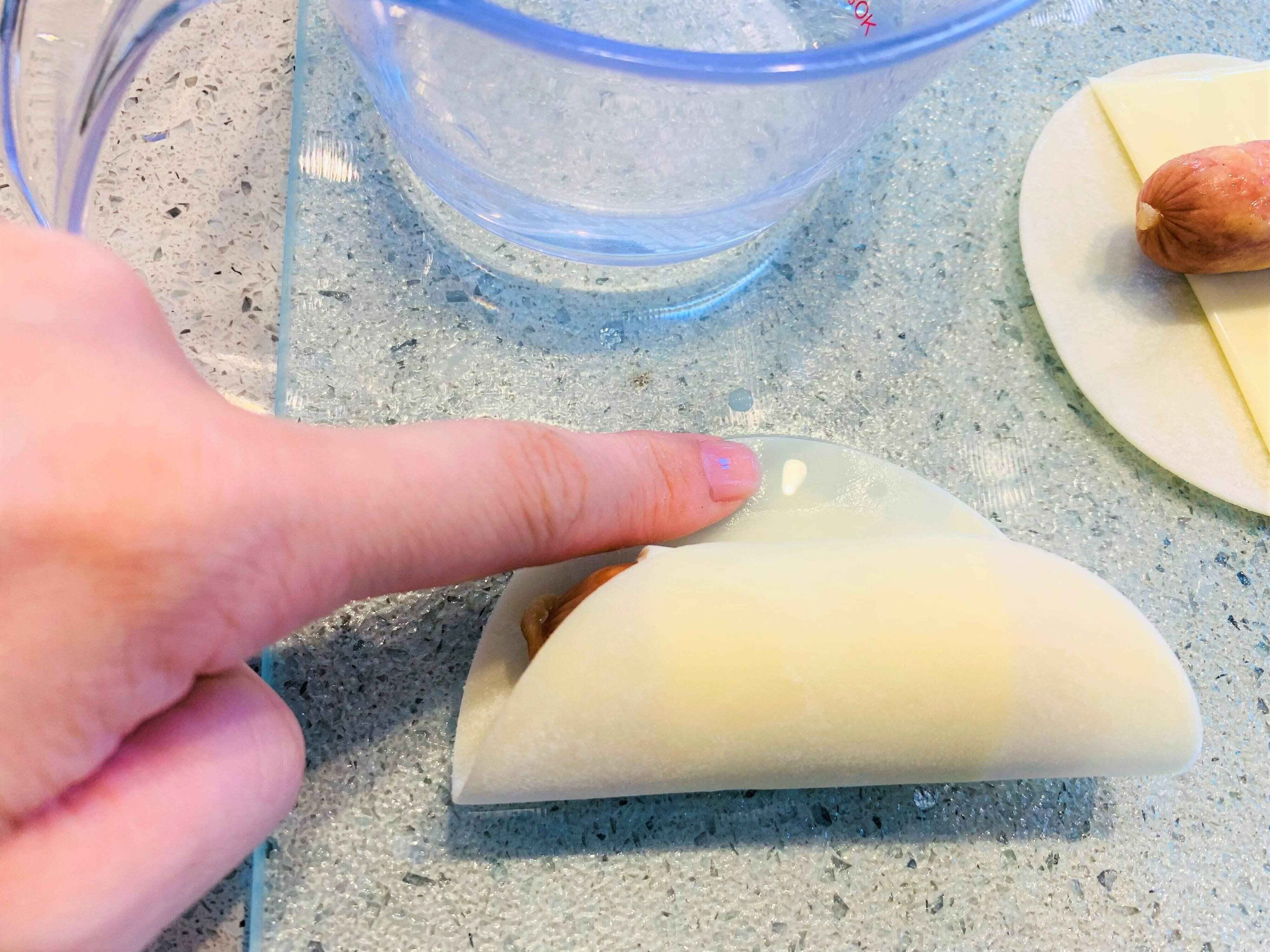 くるっと巻き、皮に水をつけて止めます。