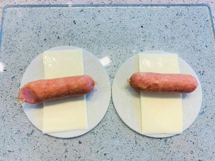 スライスチーズがはみ出そうな時は、先にソーセージにチーズを巻いておくと上手くいきます。