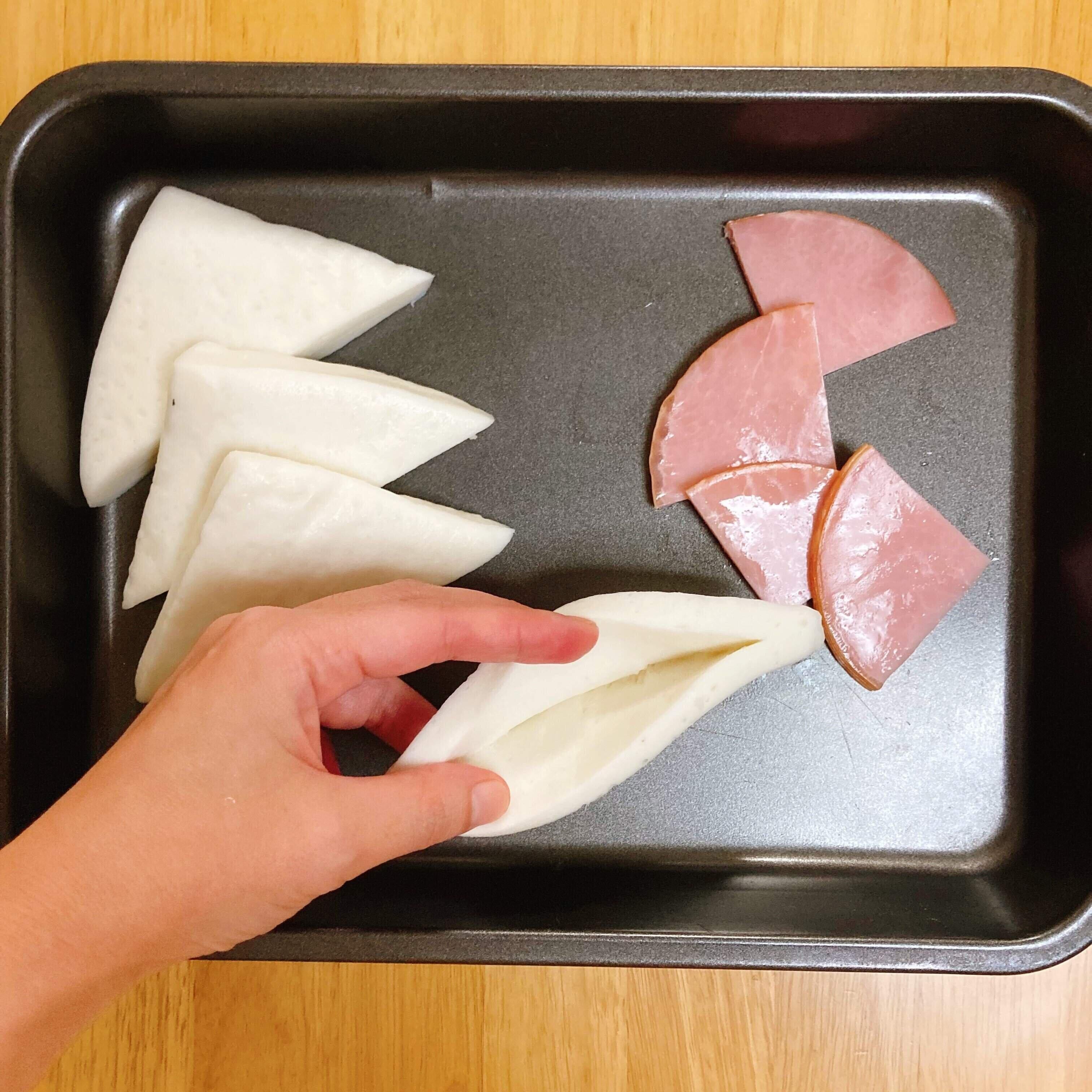 はんぺんをナナメに切り、切った面に切れ込みを入れます。