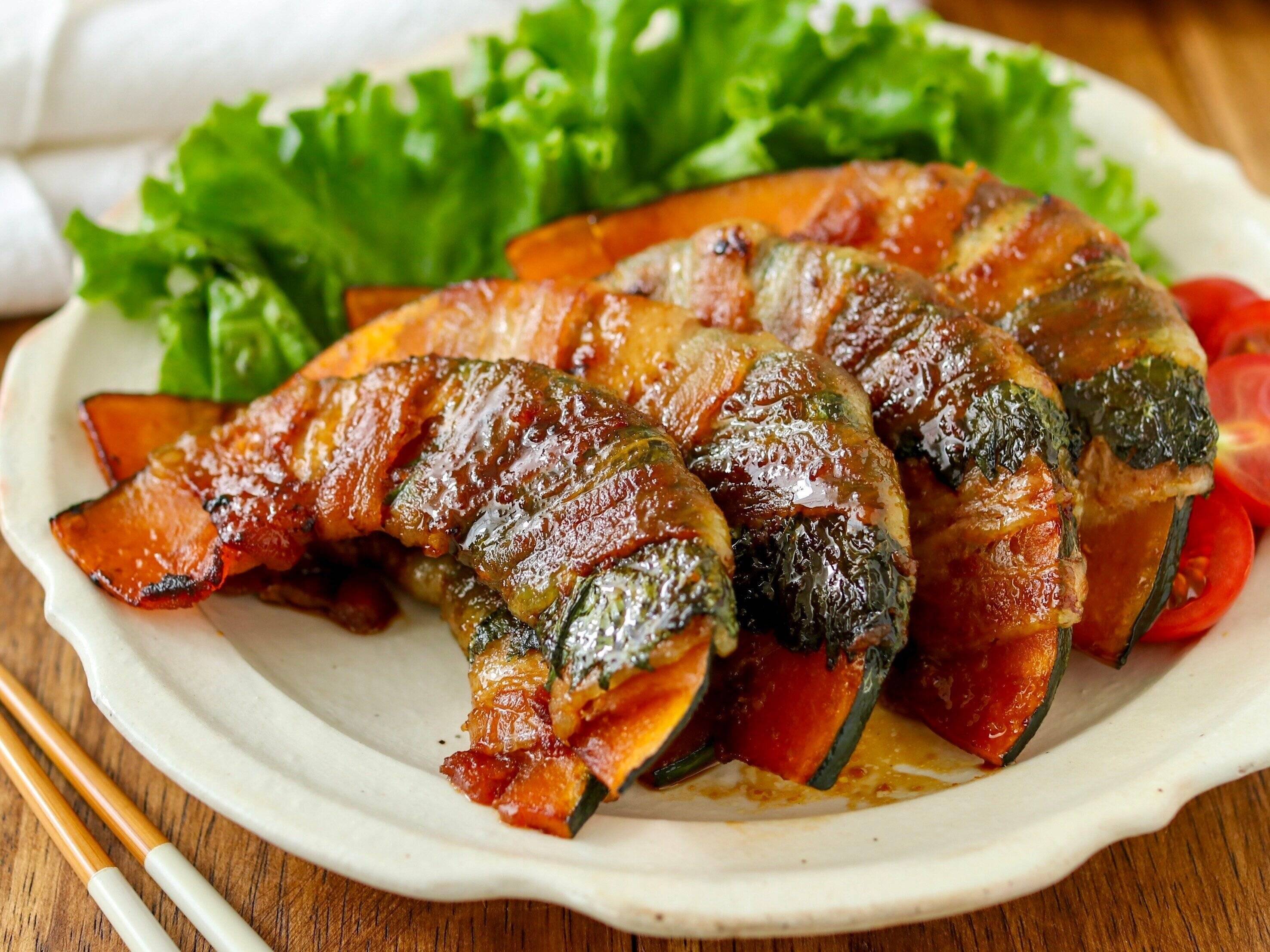 今回は主役の野菜にかぼちゃを使います。豚バラ肉で巻く時に大葉を挟み込むことで、かぼちゃの甘ったるさを軽減。