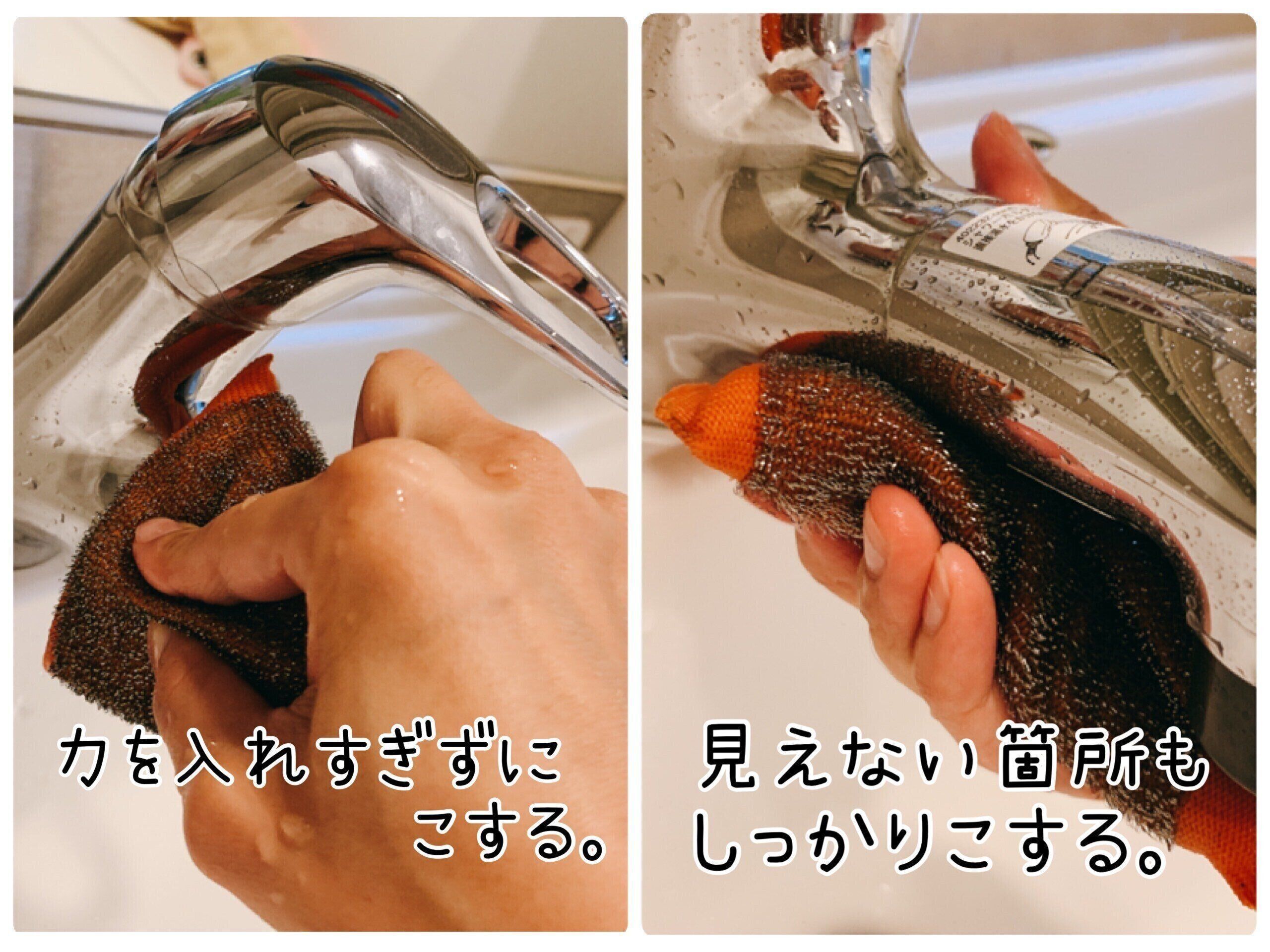 水でぬらしたコゲ取りスポンジを蛇口にあてて、優しくこすってください。見えない箇所こそ水アカが残りやすくガリガリに悪化してしまうので、見えない箇所も忘れずしっかりこすってください。