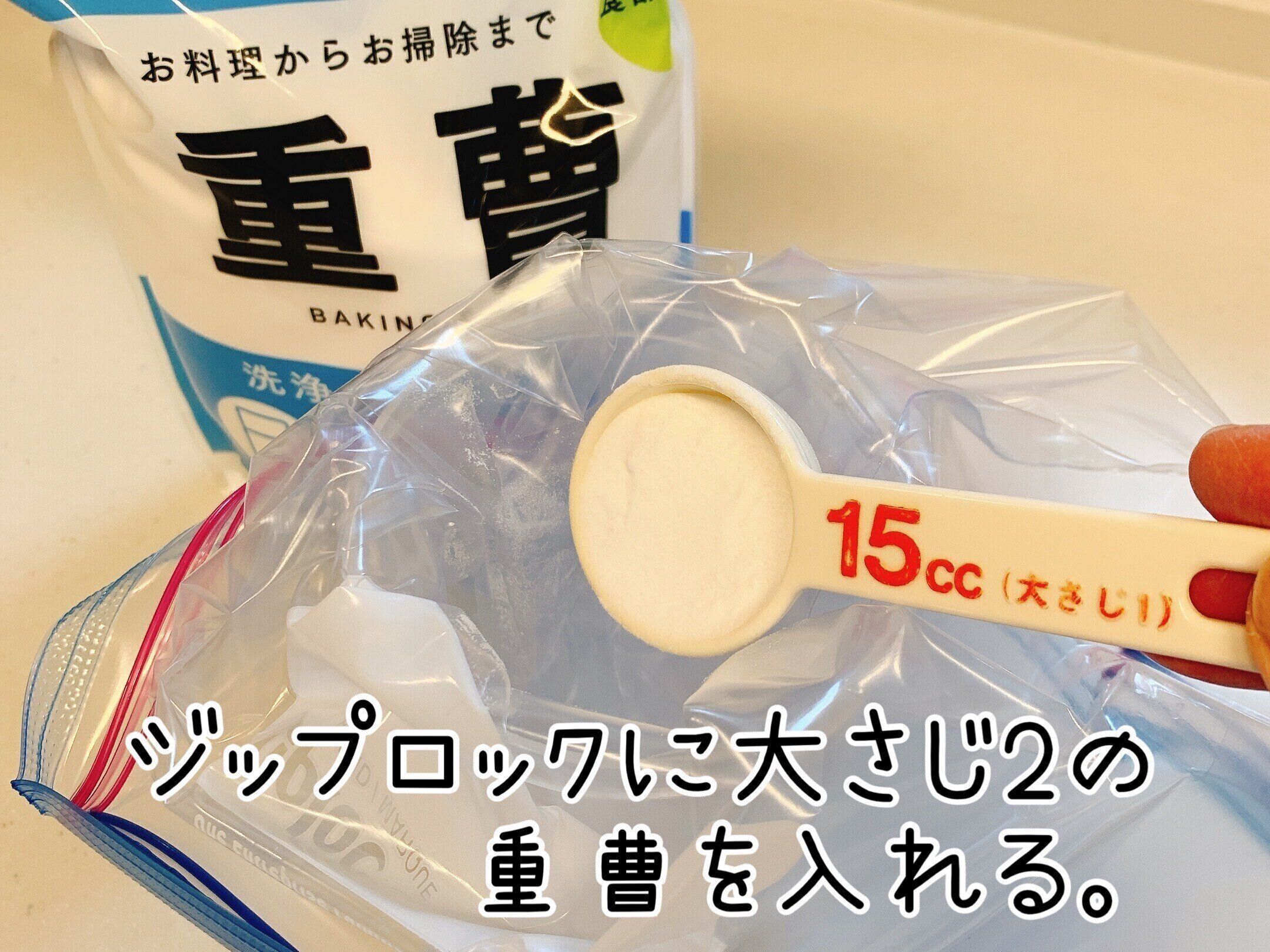 ジッパーつきポリ袋に重曹を入れます。お湯1Lに対して大さじ1の重曹を入れます。五徳洗いでは2Lのお湯を使うので、重曹は大さじ2入れます。