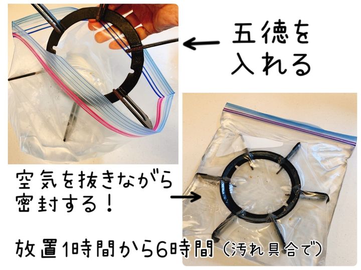 私は3時間つけおきしてからジッパーつきポリ袋内のお湯を捨てました。使い終わったジッパーつきポリ袋はお湯ですすいで洗い乾かして保管します。また他の五徳のつけおきの時に再利用します。