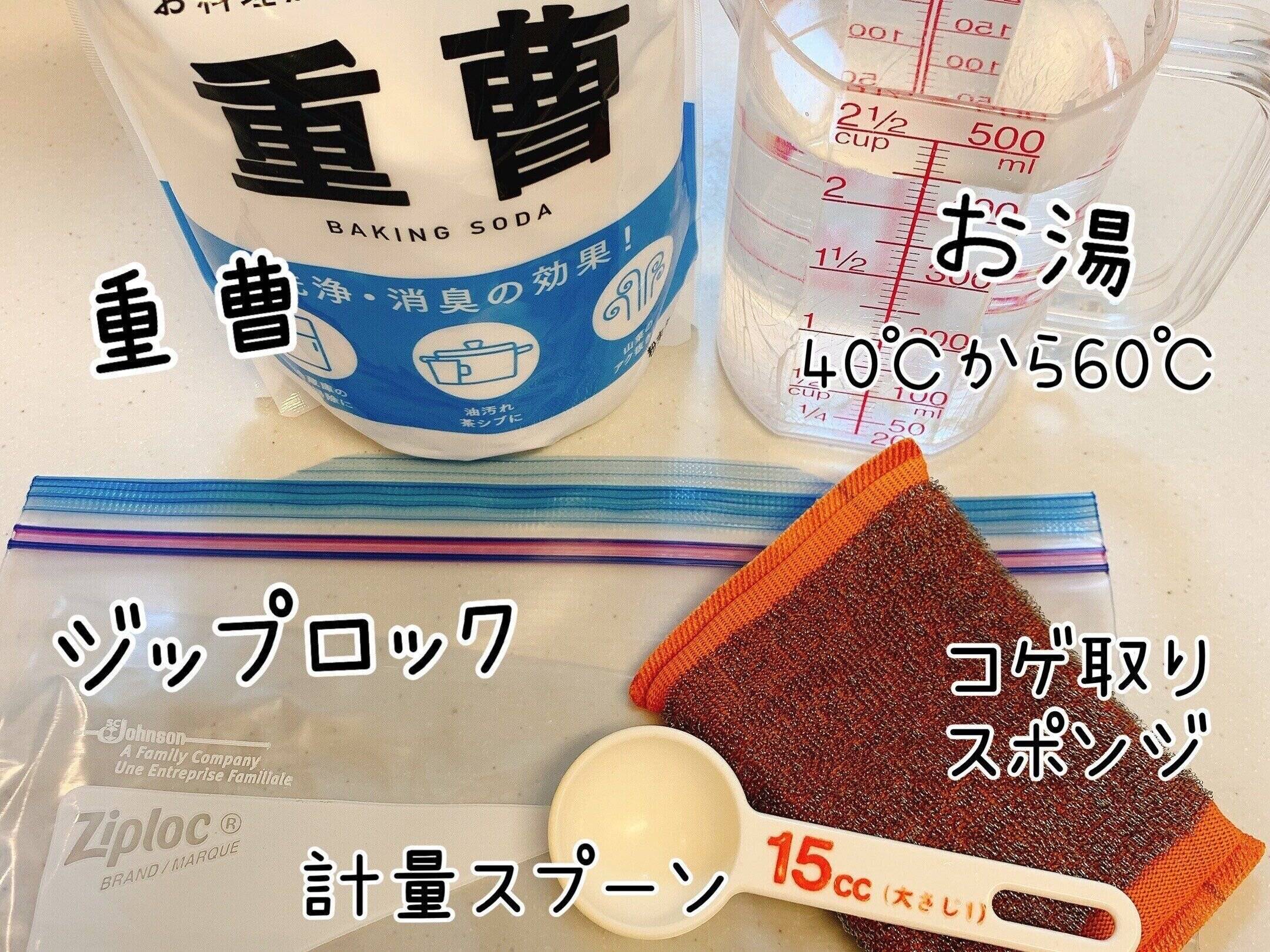 五徳まる洗いで使う道具は、重曹、ジッパーつきポリ袋、お湯(40~60℃)コゲ取りスポンジ、計量スプーンです。特別な道具は使わないので、家にあるものを活用できると思います。