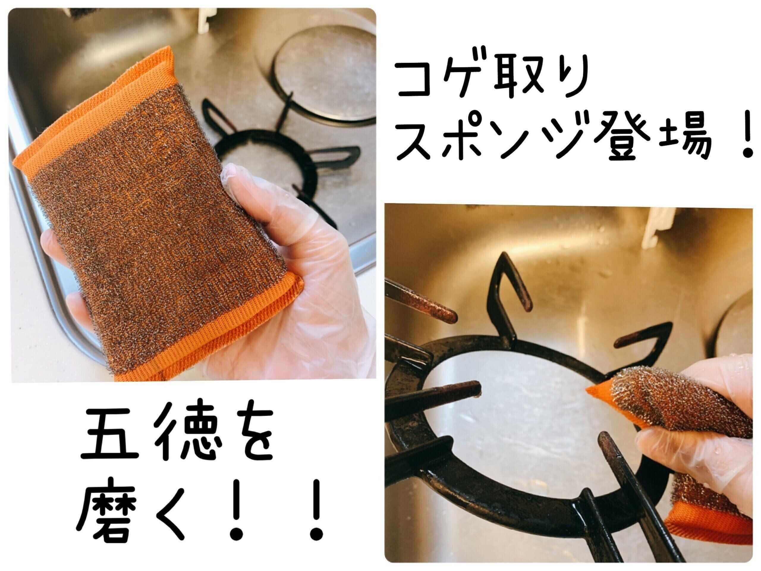 つけおき洗いした五徳はそこまで汚れがひどくなかったので、重曹とコゲ取りスポンジでコゲがとれました。しかし、頑固なコゲや汚れはつけおき洗いではとれないこともありますので、ご注意ください。判断材料としてはコゲが五徳に分厚くついている場合はつけおきではとれない可能性もあります。五徳によっても使用頻度の違いがあります。よく使う箇所は五徳もコゲがつきやすいですが、あまり使わない箇所は汚れもひどくないかもしれないので、よく観察してみてください。