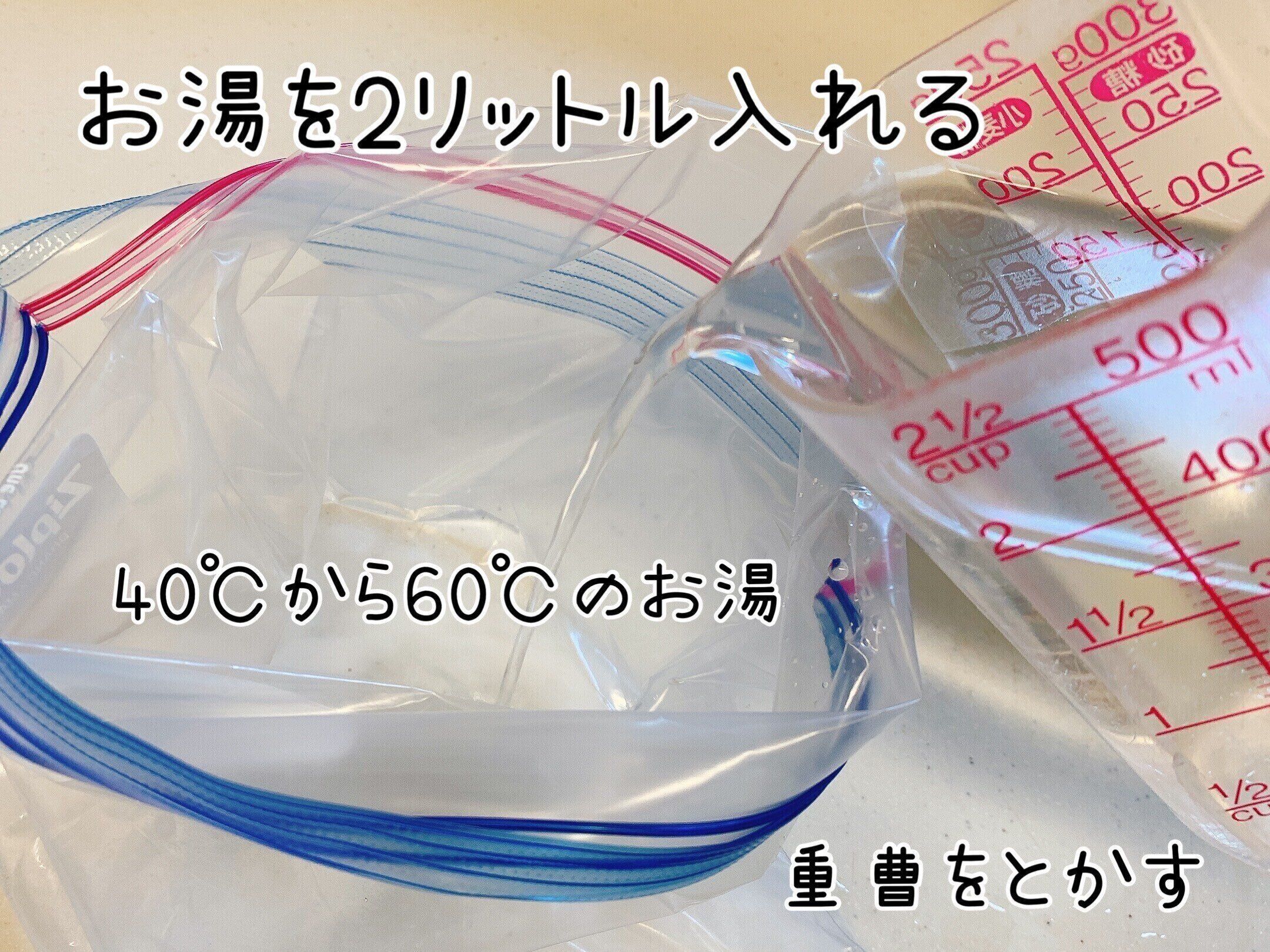 1Lお湯を入れたところで、一度ジッパーを閉めて重曹が溶けるようにジッパーつきポリ袋をジャバジャバ揺らしましょう。その際、こぼれないように注意してください!再度ジッパーを開けて残りのお湯1Lを入れてください。