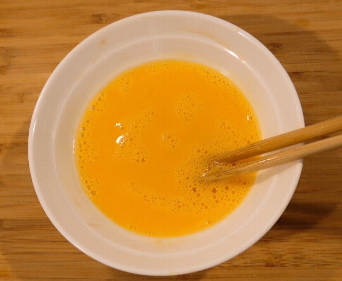 全卵はしっかり溶きほぐします。はしで白身をつまむようにすると均一に混ざりやすくなります!