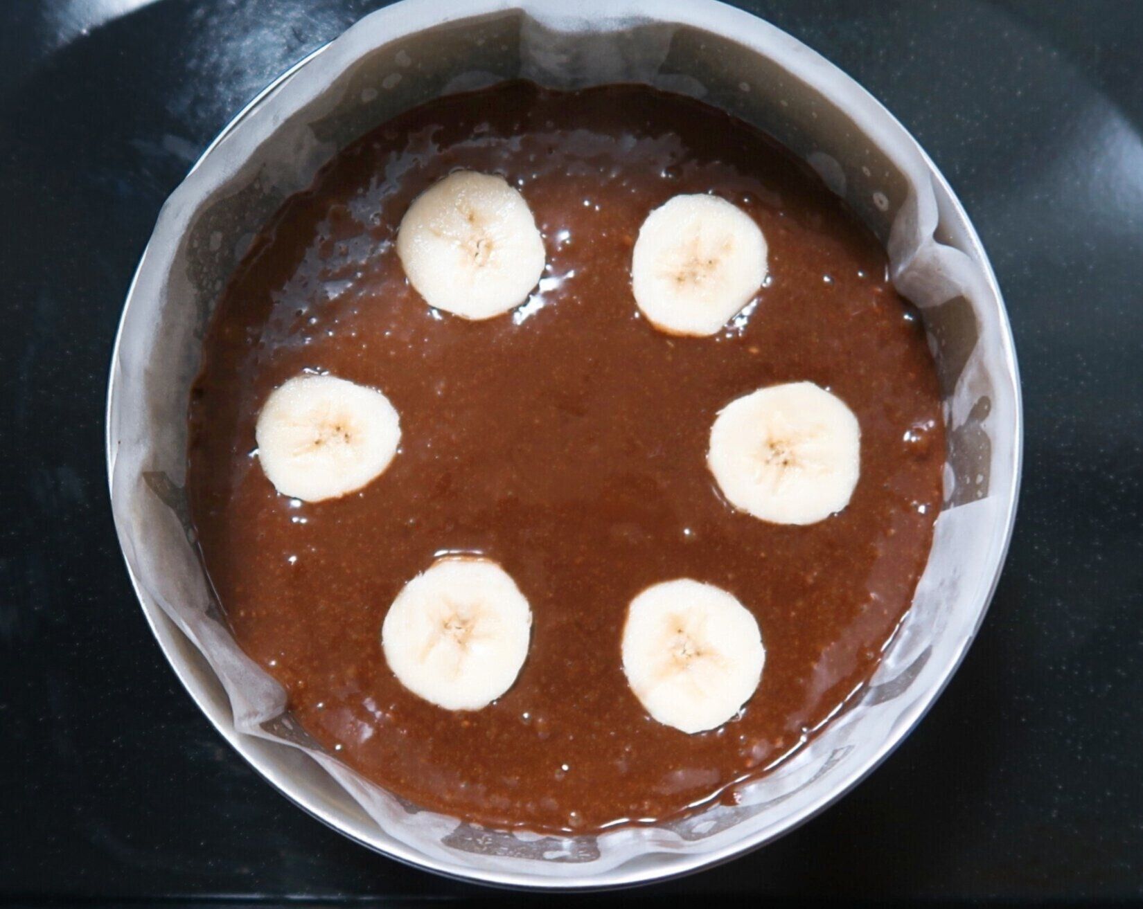 クッキングシートをしいた型に生地を流し入れます。スライスしたバナナを並べ指でかるくおさえ、180度に予熱したオーブンで45分焼きます。