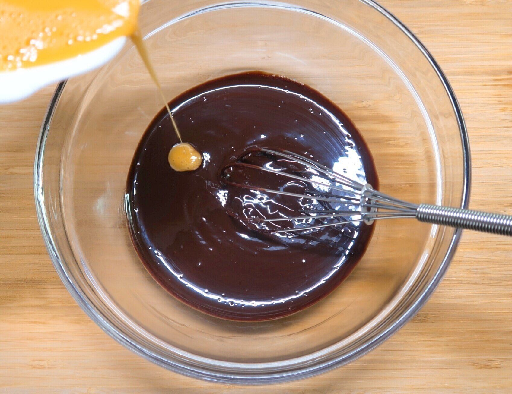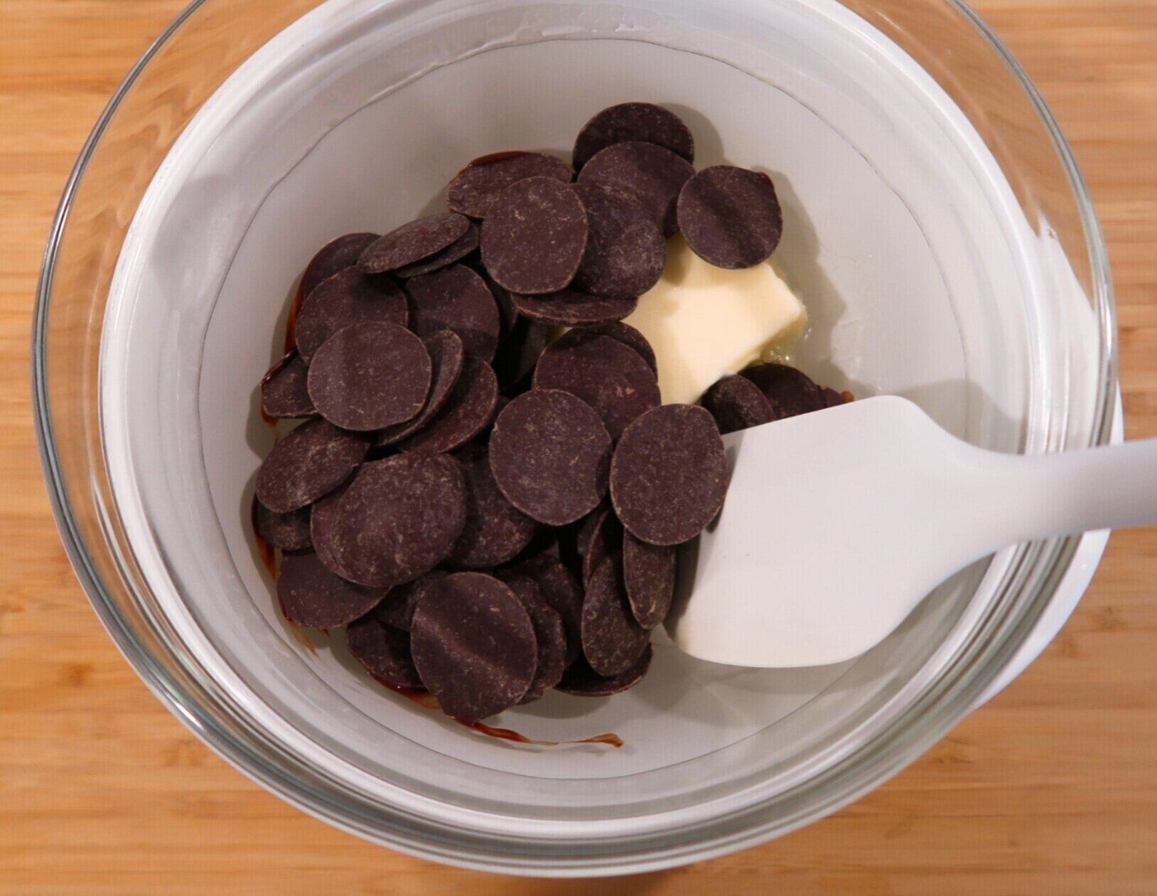 ボウルにチョコレートと常温に戻したバターを入れ、50~55度の湯せんにかけて溶かします。高温によりチョコレートの風味がとんでしまうのを防ぎます。