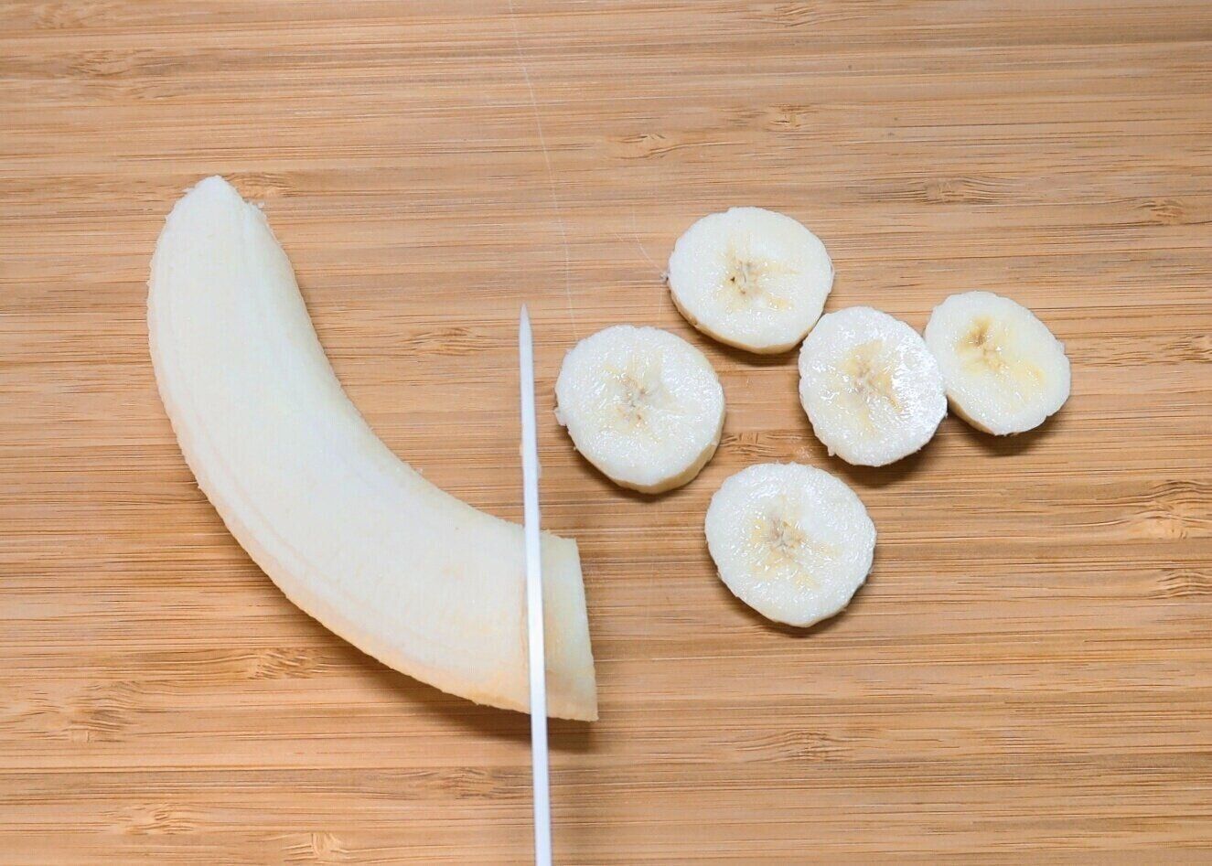 バナナは飾り用に6枚スライスします。ラップをかけておくと変色を防ぐことができます。