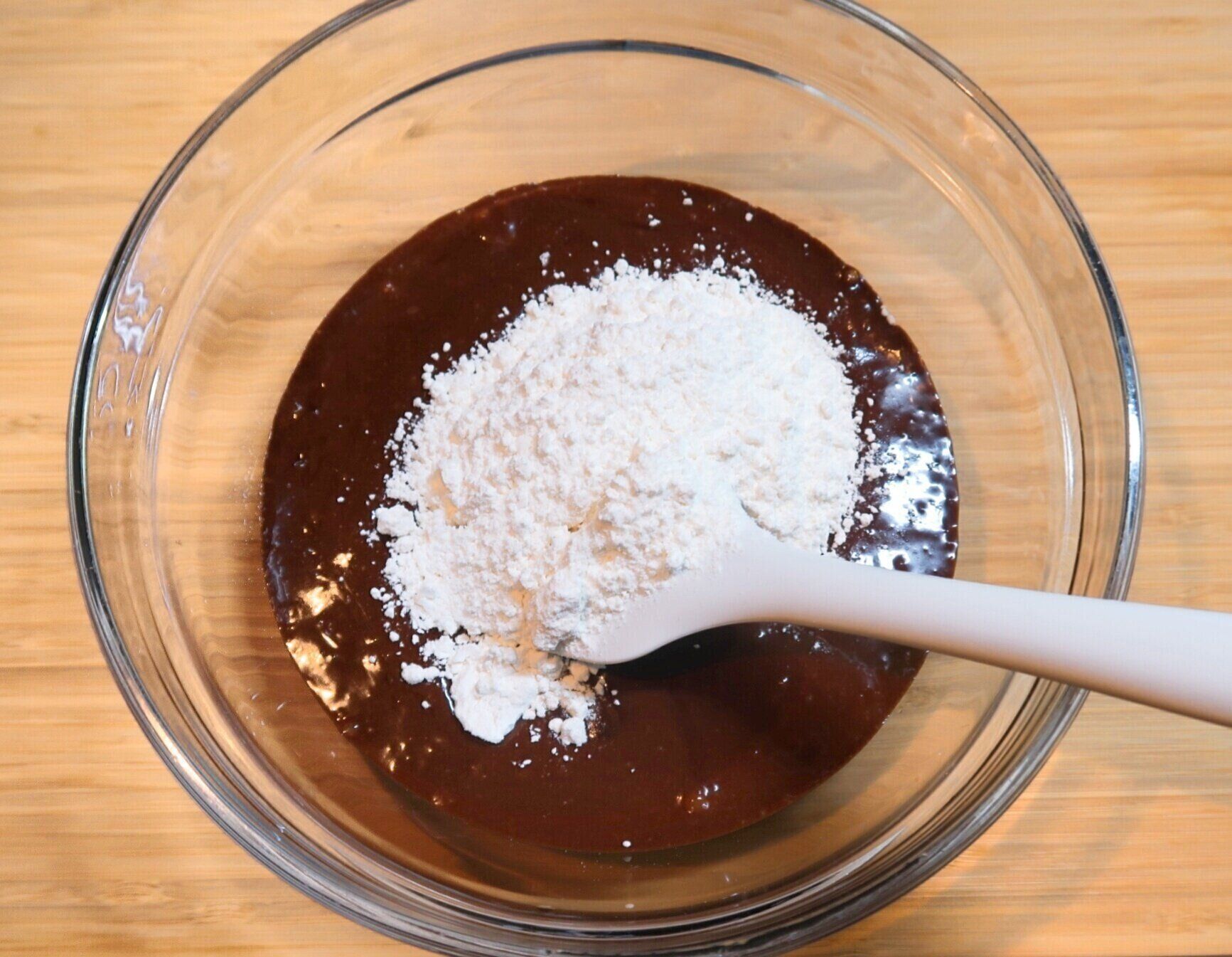 さいごにホットケーキミックスを一度に加え、ゴムベラで粉けがなくなるまで混ぜます。