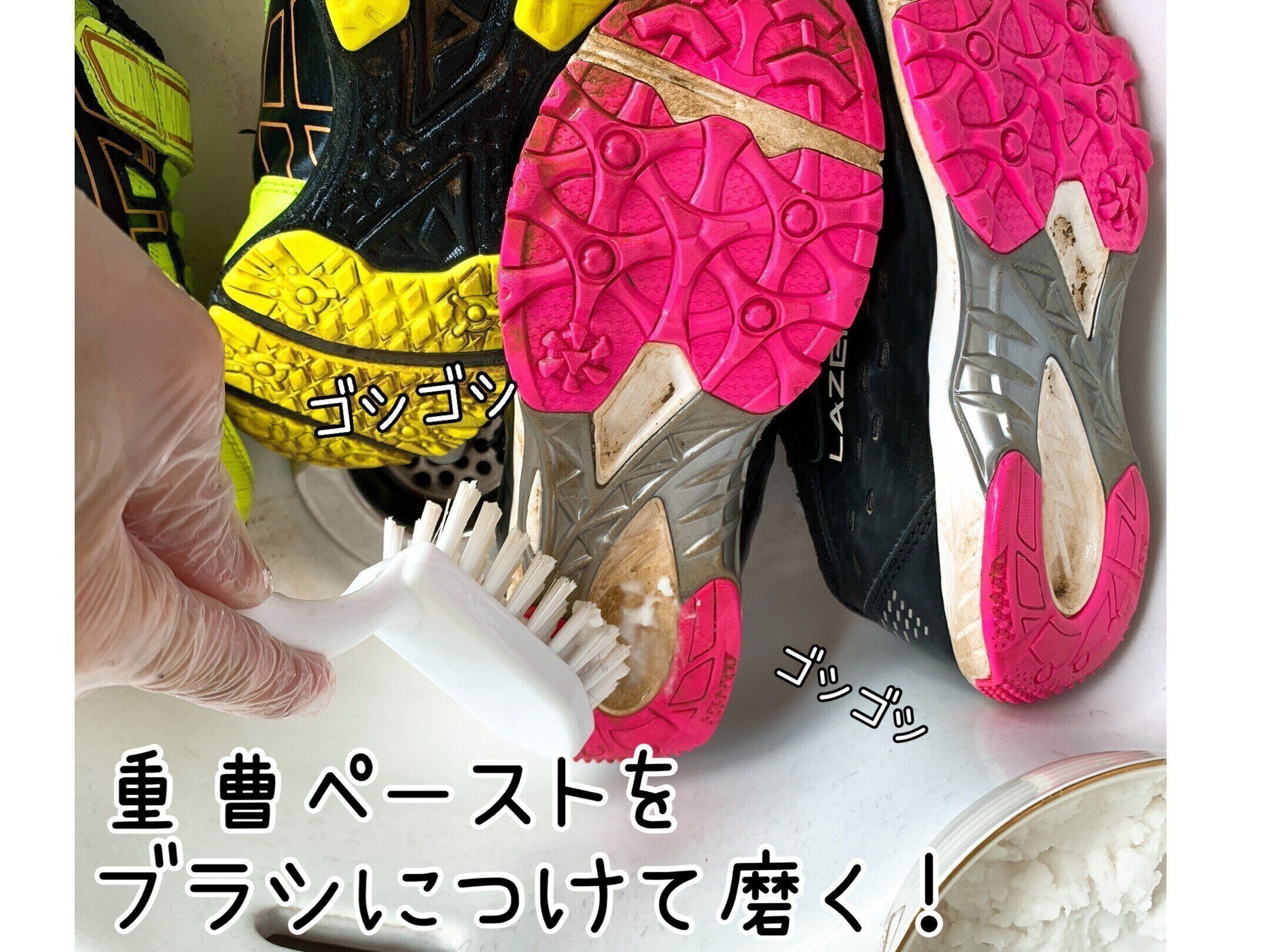 ブラシに重曹ペーストをつけて、靴に残っている泥汚れを磨いていきます。ブラシは使い古しの歯ブラシでもいいですが、靴は磨く範囲が広いので、大きめのブラシを準備することをおすすめします。100均にも靴用のブラシが売られていますので探してみて下さい。