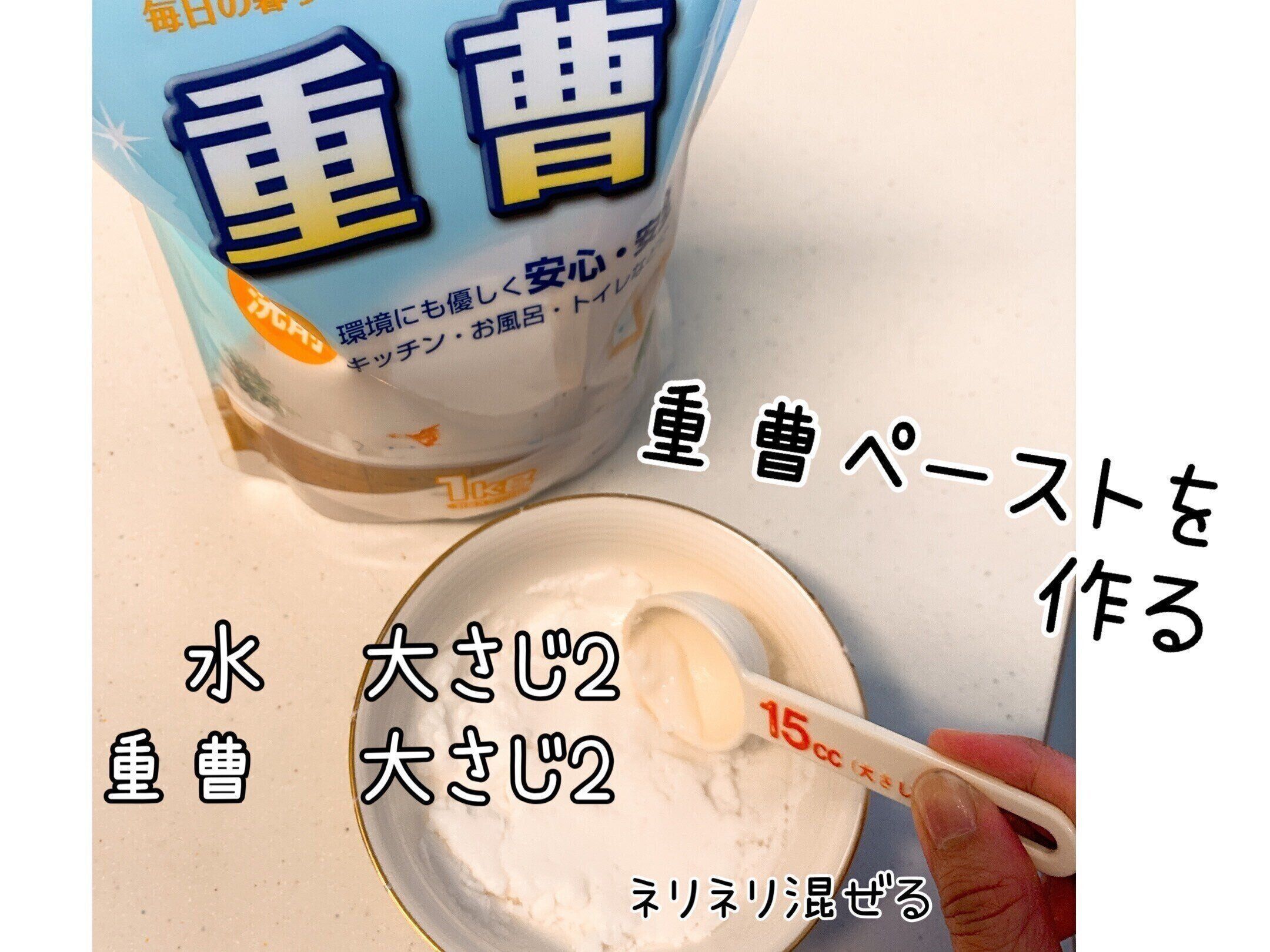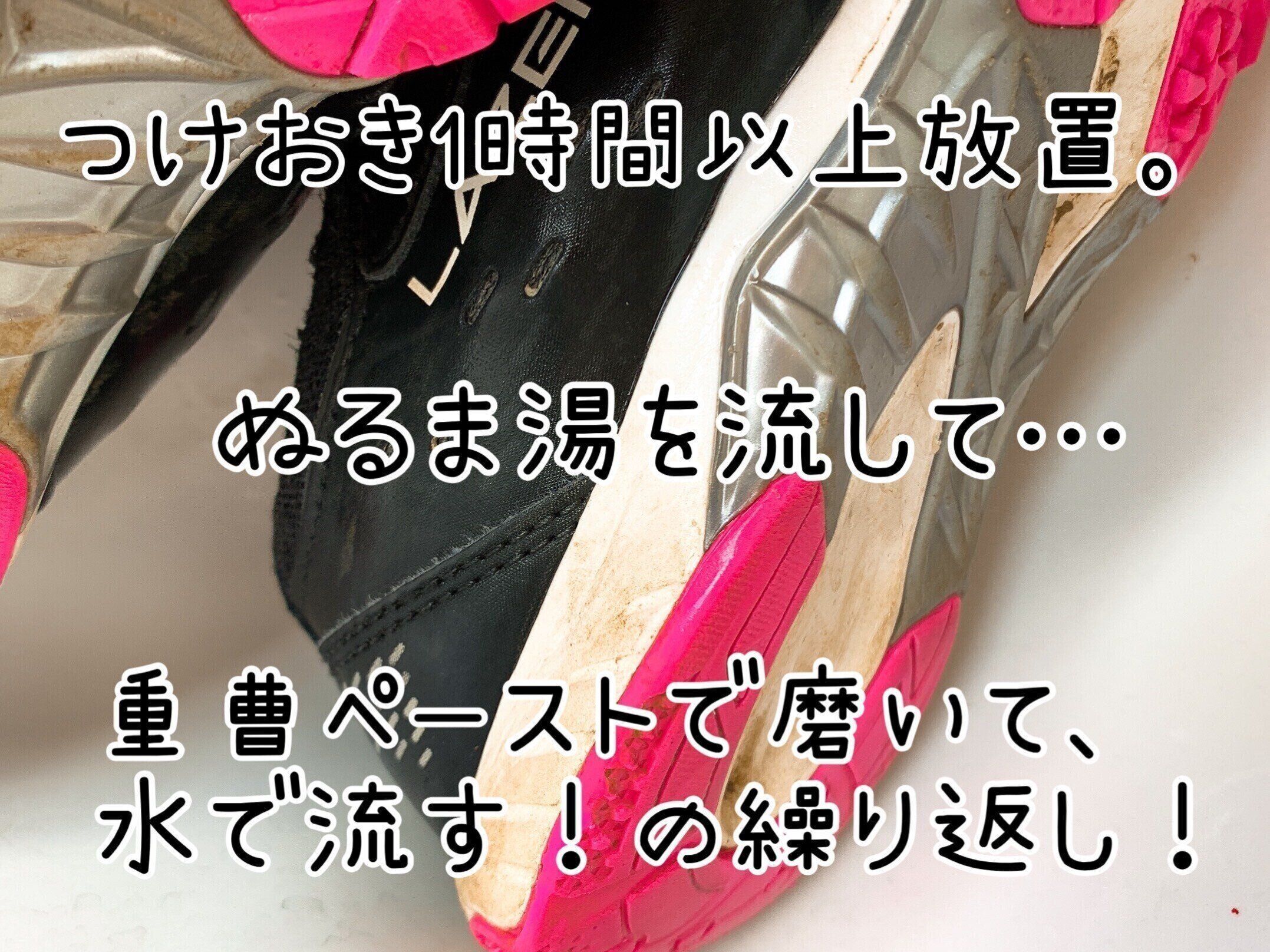 つけおきした後は重曹ペーストで磨いていきます!つけおきしただけで泥汚れがスルッと取れる訳ではないので、ここからが新品のような仕上がりにするための工程となります。