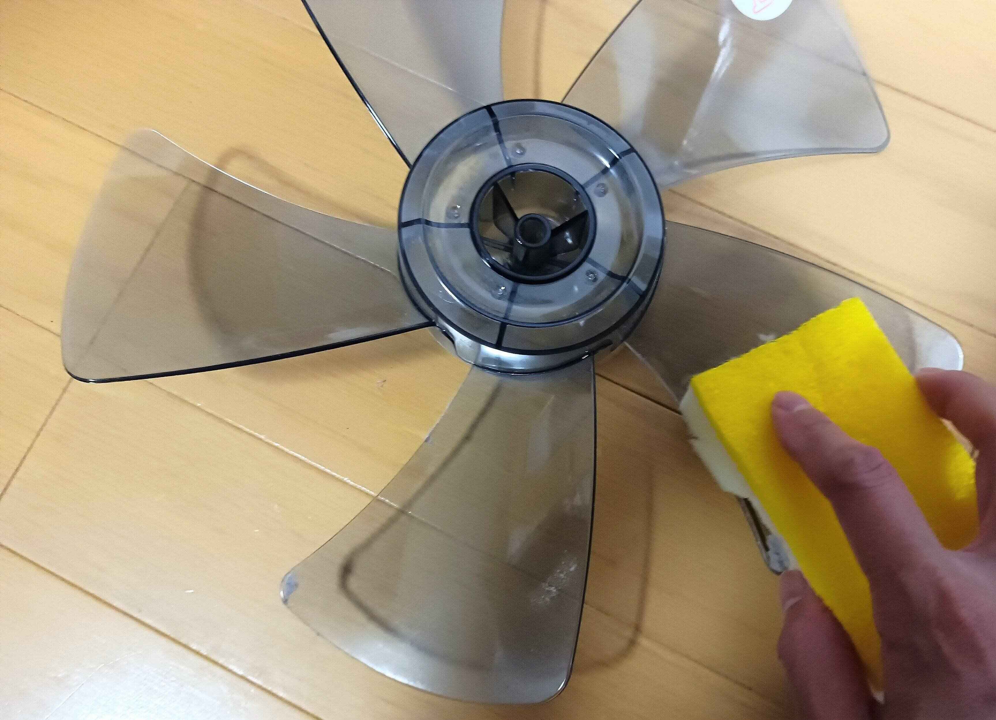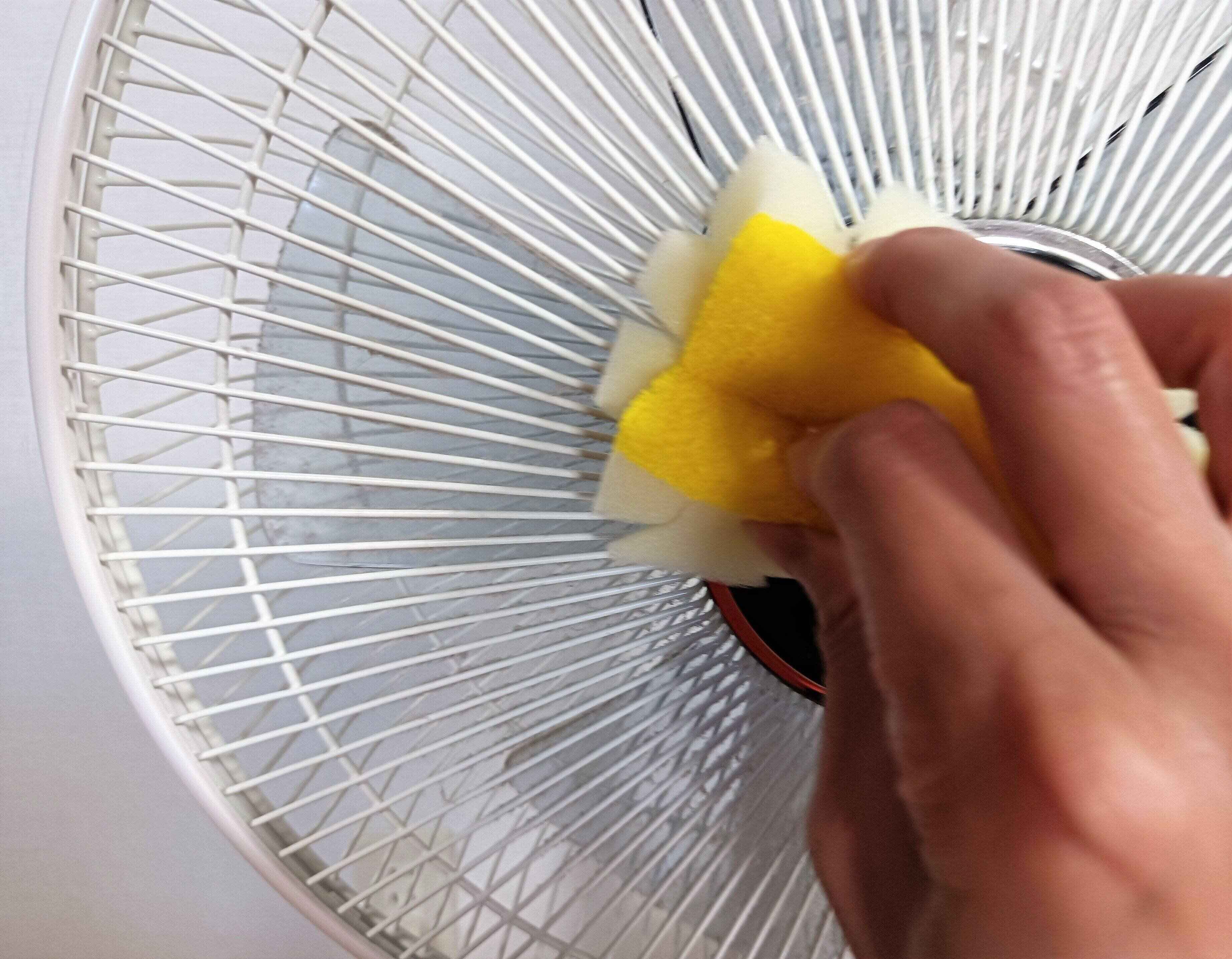 このようにホコリがたっぷりたまってしまった扇風機を、切り目をいれたスポンジで軽くこすっていきます。