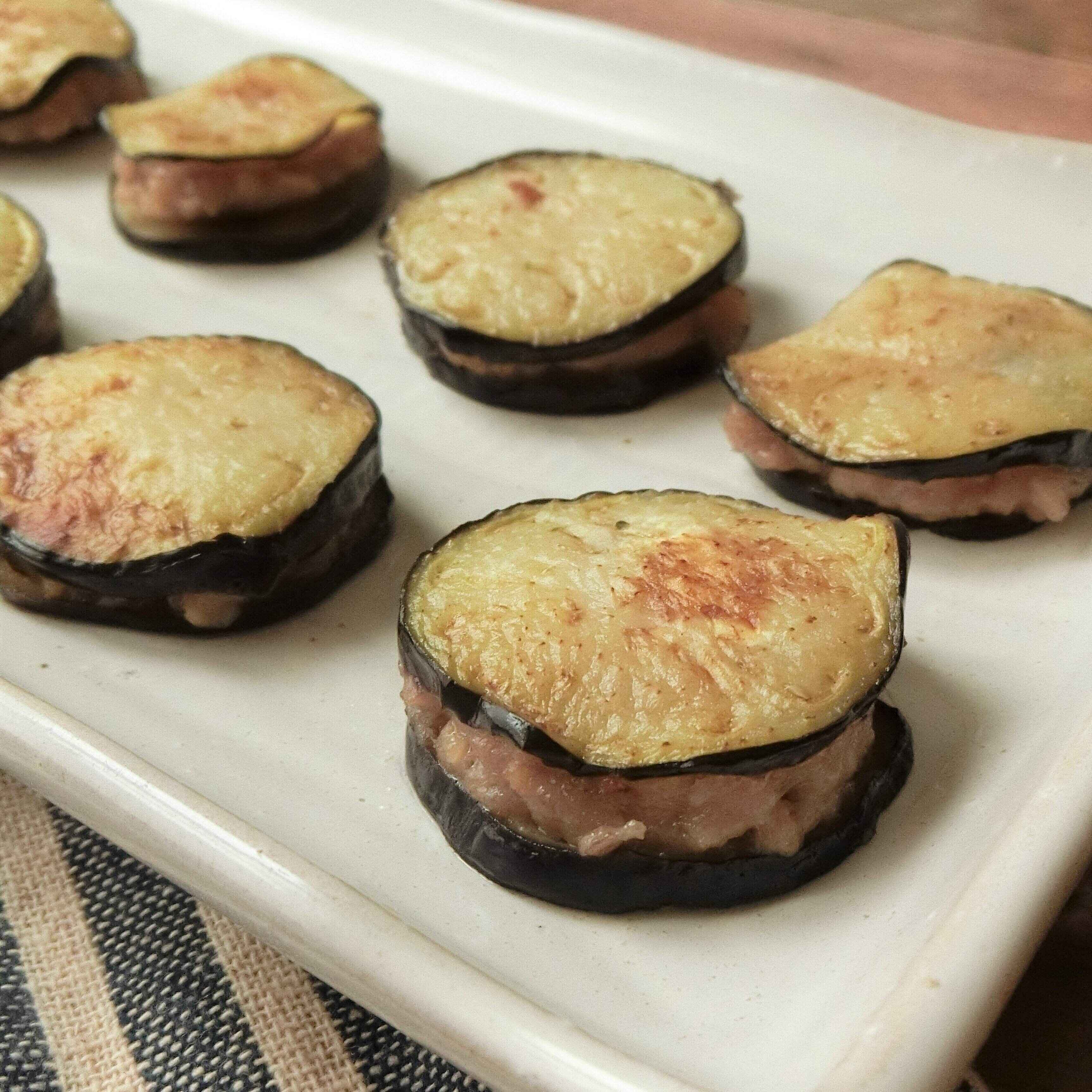 ナスは薄く切りすぎると、ひっくり返すのが大変になるので5mmくらいがちょうどいいです。具をたくさん入れすぎると火のとおりが遅くなるので、気持ち控えめにするのがオススメです。ナスの長さや太さによって、具をはさむ量が変わるので調節してください。