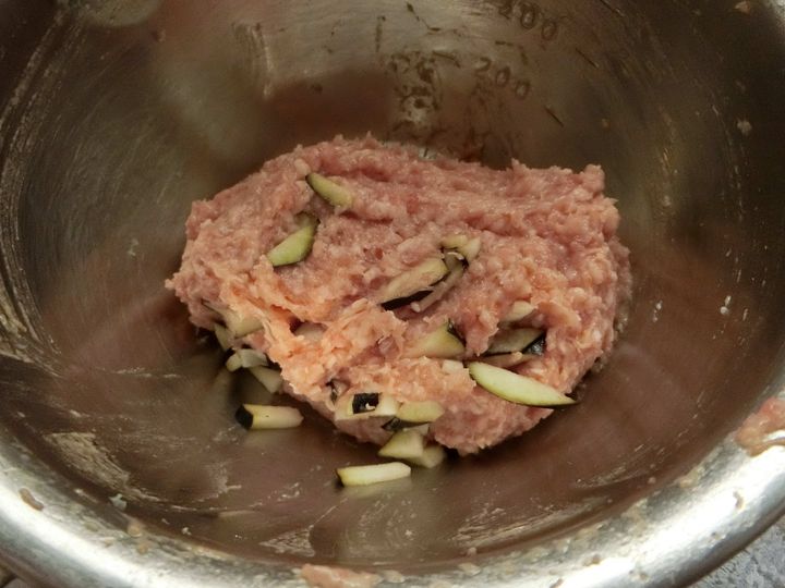2.Aの材料を混ぜあわせたら、1のこまかく切ったナスも混ぜます。