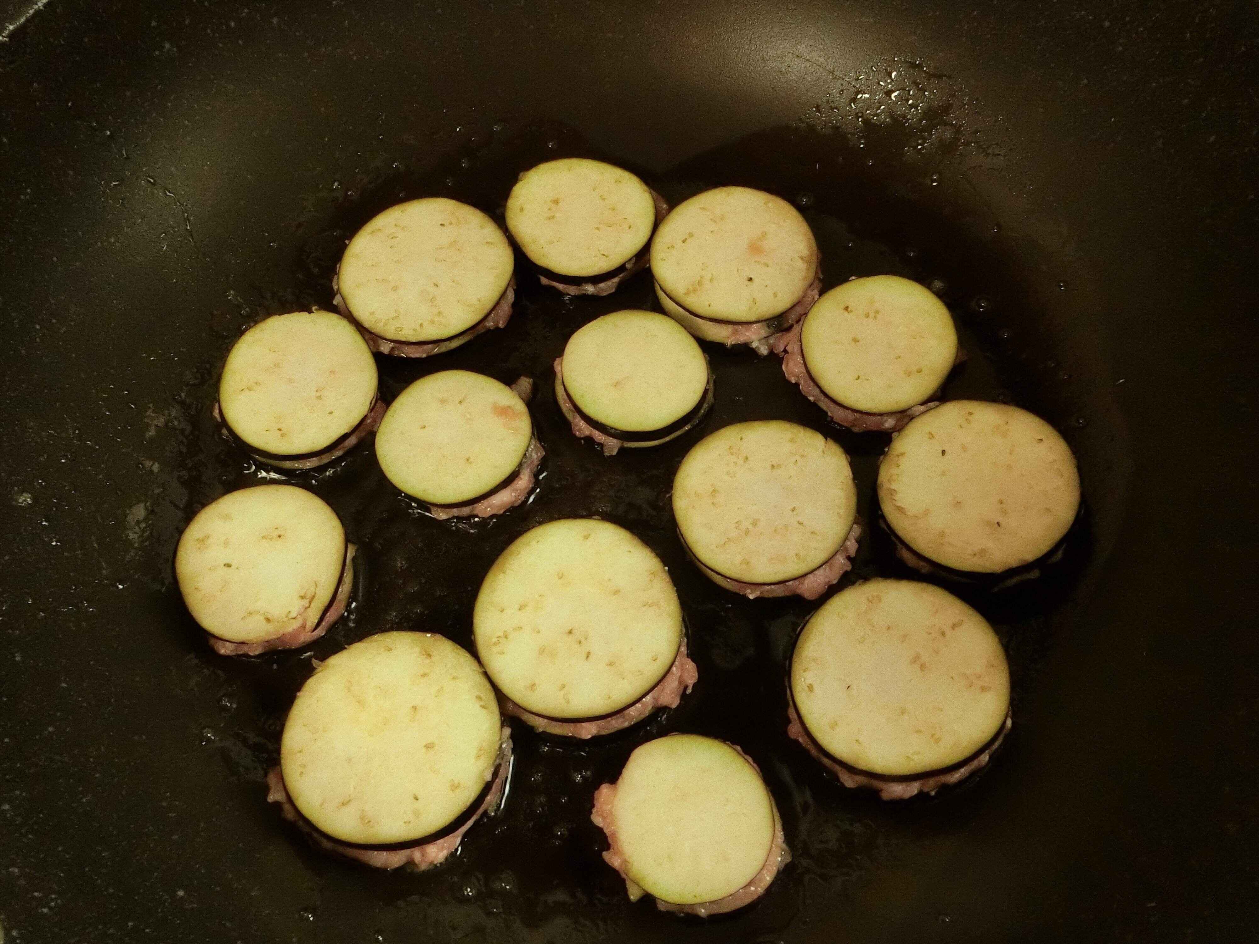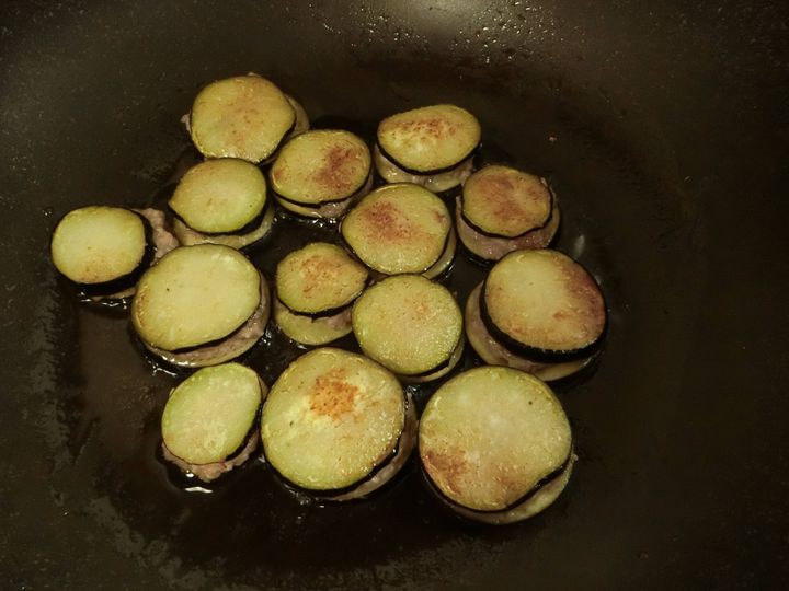 3.具をナスではさみます。フライパンに油をひき、ナスを並べてフタをして焼きます。