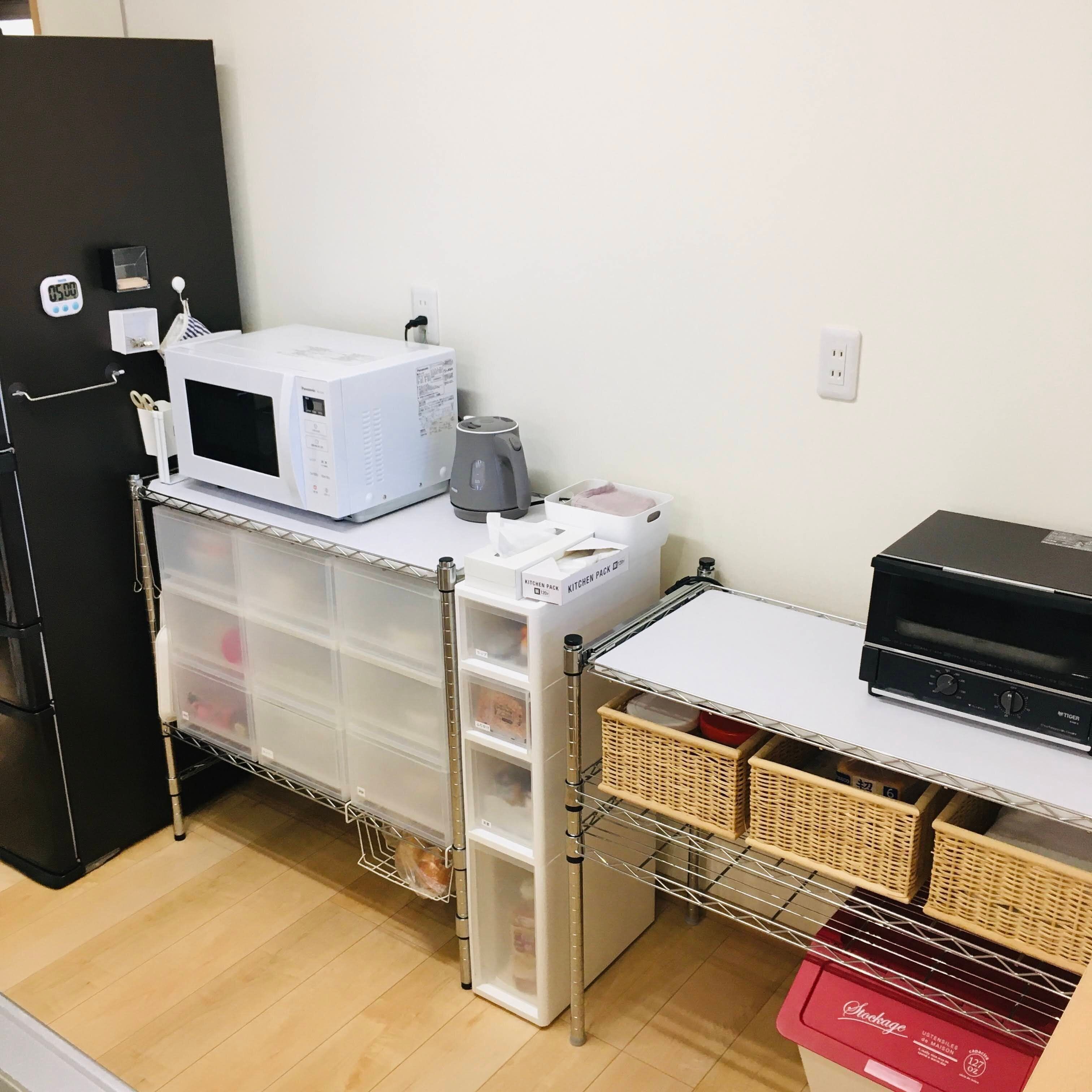 キッチンラックに家電を置いています。こちらもホコリが溜まりやすい場所なので、テーブルを拭いたついでにサッと拭きます。レンジの中、トースターの扉もアルコールをシュッとして拭きます。