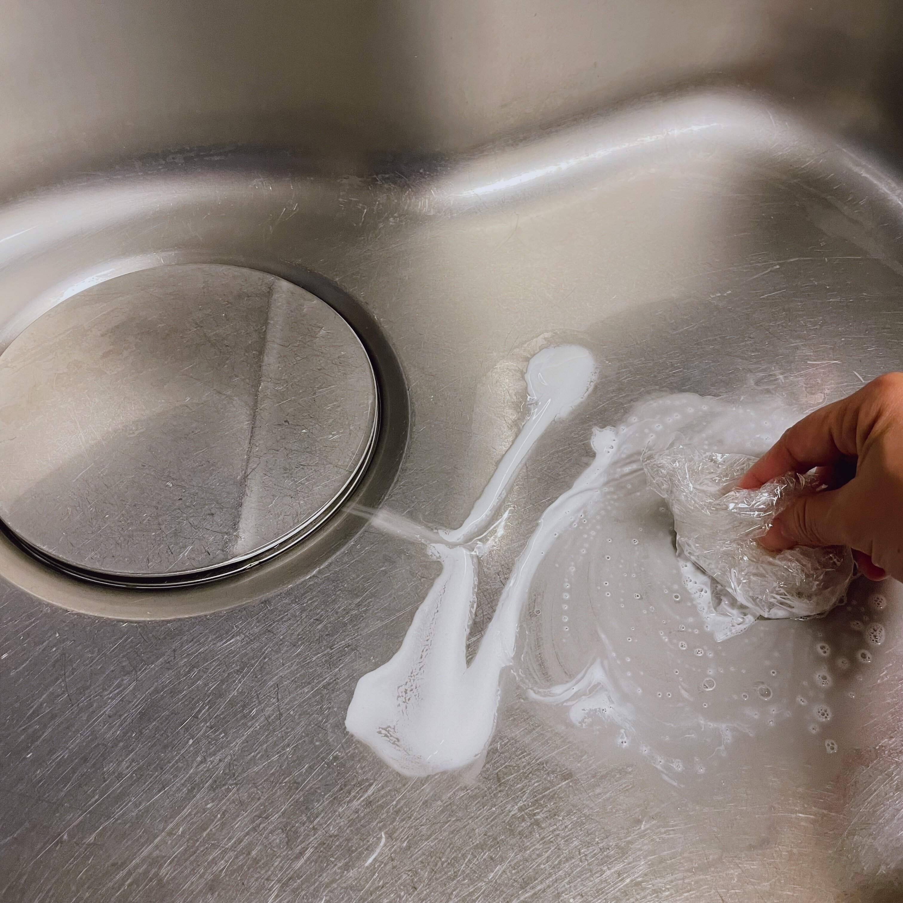 使い方はとてもカンタン!クリームクレンザーをシンクに少量垂らして、丸めたラップで軽くこするだけです。最後に、排水口のパーツもラップで汚れを落とします。