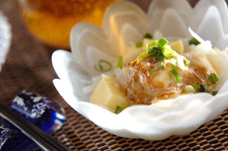 卵豆腐のとろろがけは、マヨネーズが意外にも具材とマッチし、あっさりとした卵豆腐に濃厚さが加わった一品です。