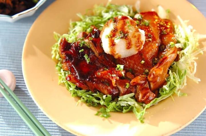 チキンのジンジャー照り焼きでは、鶏肉を焼いたときにでる脂分をいったん捨てることで、カロリーを落としています。照り焼きのたれにショウガを入れ、照り焼きに大根おろしやネギをトッピングすることで、鶏の照り焼きに不足している野菜類を補えます。