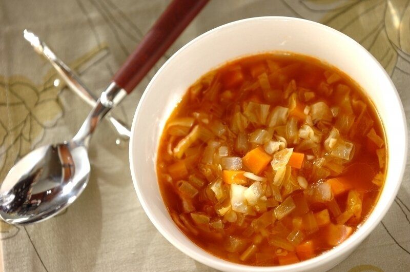 次に紹介するおすすめのアレンジレシピは、野菜といっしょに煮込んでつくるトマトベースのスープです。押し麦の下処理が必要なく、1つの鍋でできるところもうれしいポイントになっています。