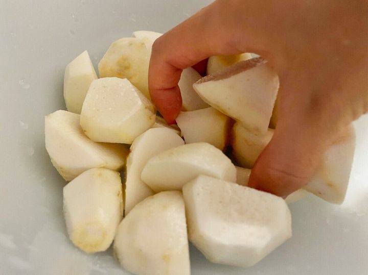 (3) ぬめりが出ないので、すべらず簡単に皮がむけます。お好みの大きさにカットして煮物などの料理に使いましょう。
