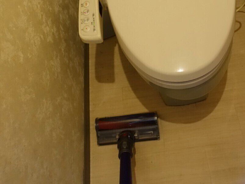 最後に床を掃除します。まずは掃除機をかけてホコリを取ります。ホコリをとったら拭き掃除です。壁以上に尿ハネ汚れがついていますので、念入りに掃除をしましょう。
