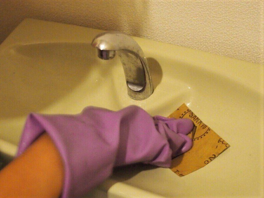 メラミンスポンジなどでこするときれいになりますが、同時に傷もつけていることもあるので、気をつけてください。これらの水アカ汚れは耐水ペーパーでこするときれいに落ちます。