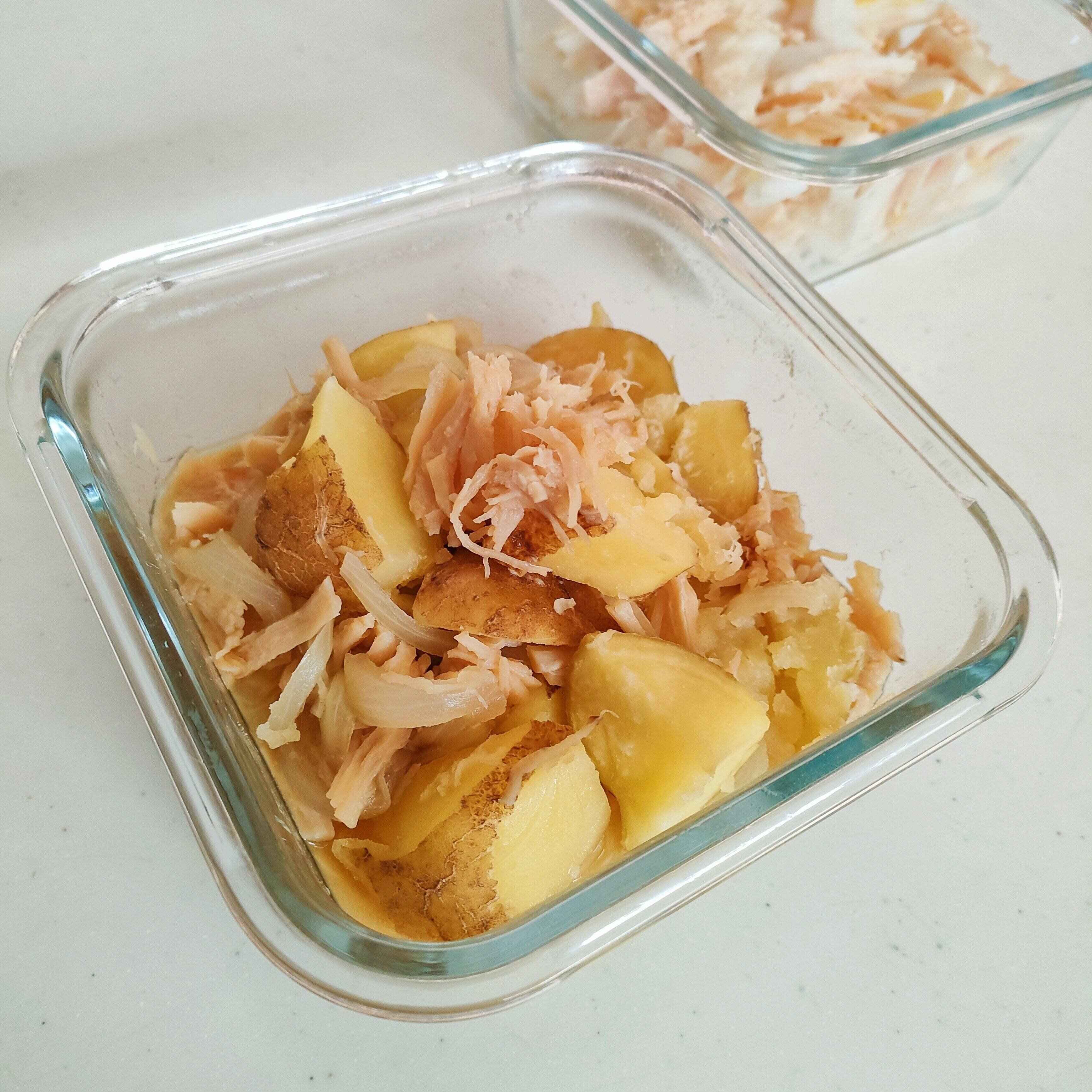 3.耐熱皿にカットしたじゃが芋、玉ねぎ、チキン缶詰の順番にのせる(チキン缶詰は軽くほぐして入れる)