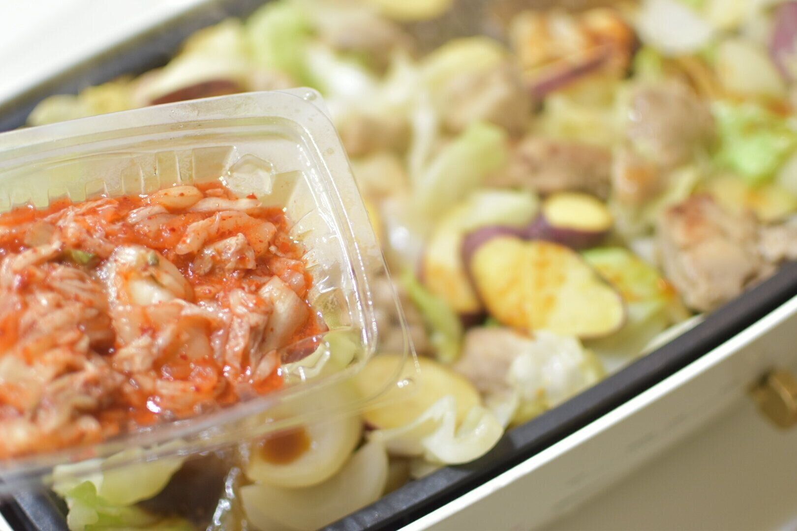 3.ホットプレートにごま油をなじませ、鶏肉を並べます。上にさつまいも、玉ねぎ、キャベツの順に重ねたらフタを閉めて蒸し焼きにします。鶏肉に火が通ったら全体を炒めて、キムチ、焼肉のたれを回しかけて味を整えます。