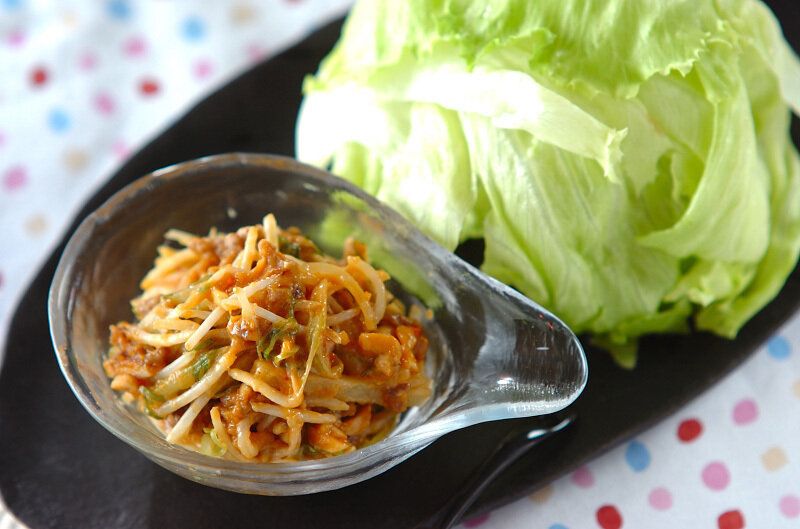 おすすめレシピ1:モヤシのピーナッツ肉みそ・レタス包み