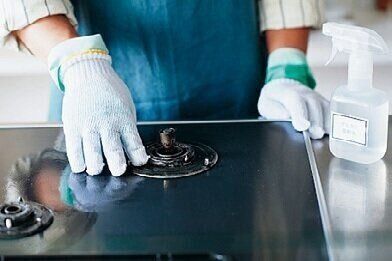 ゴム手袋の上から軍手をつけ、アルカリ電解水を吹きかける。コンロの天板、壁、換気扇カバーなど、汚れが気になる所を拭く。