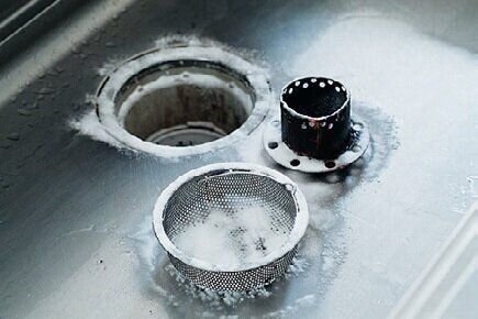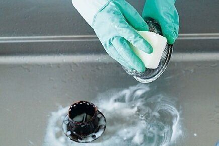 排水口を開けてパーツを取り出し、排水口の中とパーツに重曹をたっぷりとふりかける。汚れが見えなくなるくらいの多めの量でOK。