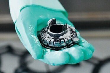 換気扇フィルター、コンロの五徳、バーナーキャップなどのパーツを、排水口に栓をしたシンクか、大きめの容器に入れる。50~60℃のお湯をはり、汚れている部分が隠れるくらいたっぷりと重曹をふりかける。汚れがひどい場合は、お湯の温度を上げる。