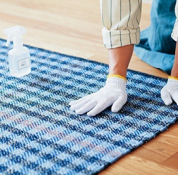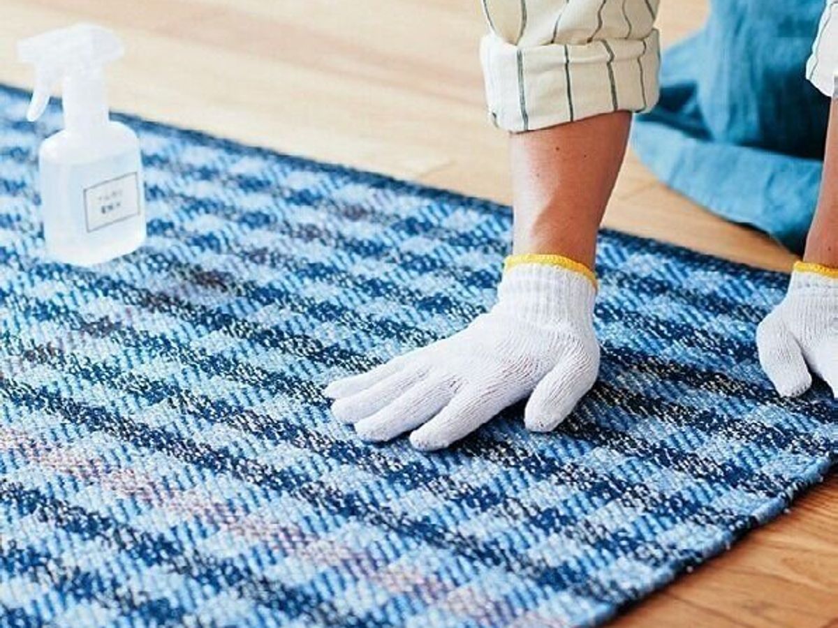 軍手にアルカリ電解水を吹きかけ、ラグの上をやさしくこすって掃除する。汚れだけでなく、ほこりや髪の毛、ペットの毛なども除去できる。ただし、ラグの材質によっては変色や色落ちなどの可能性があるので、必ず最初に目立たない所で試して確認を。