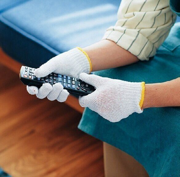 軍手にアルカリ電解水を吹きかけ、リモコン全体をなでるように汚れを取る。ボタンとボタンの間は指先を使うと効率的。家電は水分を嫌うので、スプレーは軍手がうっすら湿る程度に。