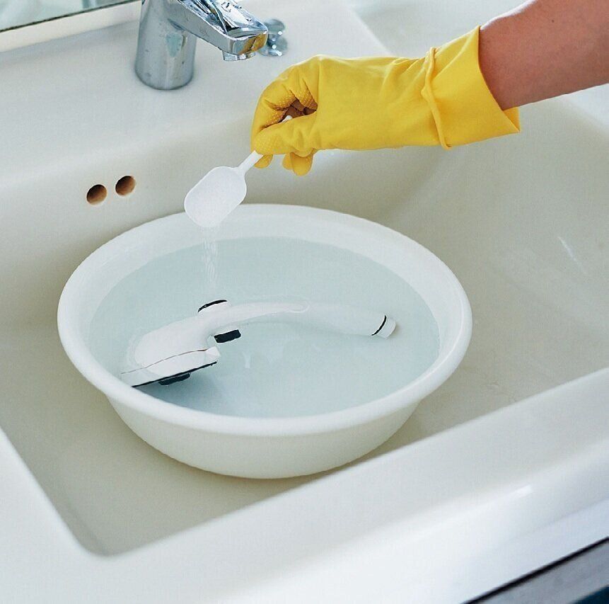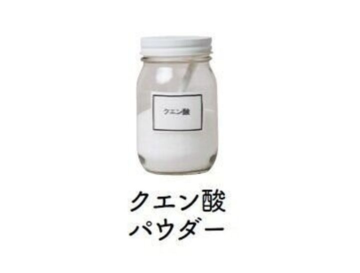 洗面器やバケツなどにシャワーヘッドを入れ、40℃くらいのお湯とクエン酸パウダーを大さじ1程度加え、30分つけ置きする。全体をスポンジでこすり洗いし、水で流せば完了。