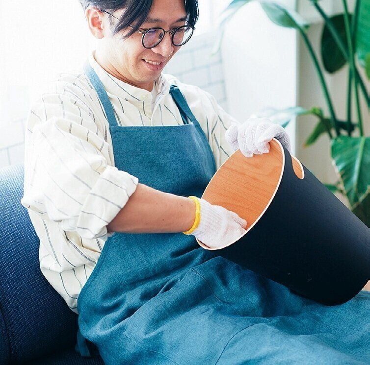 軍手にアルカリ電解水を吹きかけ、ゴミ箱の内側をサッとなでて拭く。仕上げにアルコールをスプレーするとより衛生的。