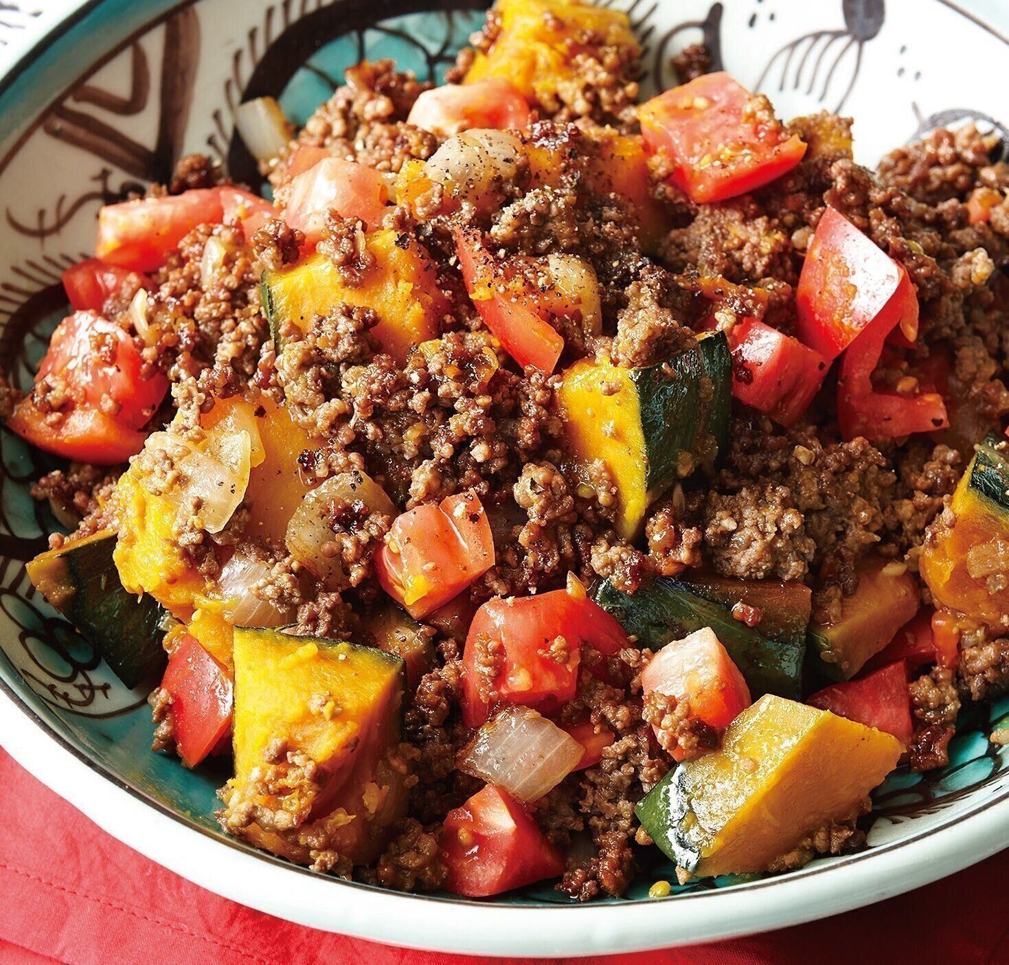 ひき肉とかぼちゃのトマト炒めは、後味がすっきりとしたさわやかな一品です。味つけ自体は濃いものの、仕上げにトマトを加えることでさっぱりと軽やかに食べられます。