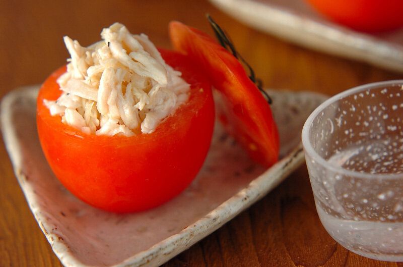 「カップトマトのサラダ」は、ヘタを切り落として中身をくり抜いたトマトの中に、加熱したささみ、玉ねぎ、生姜を刻んで入れてつくる料理です。