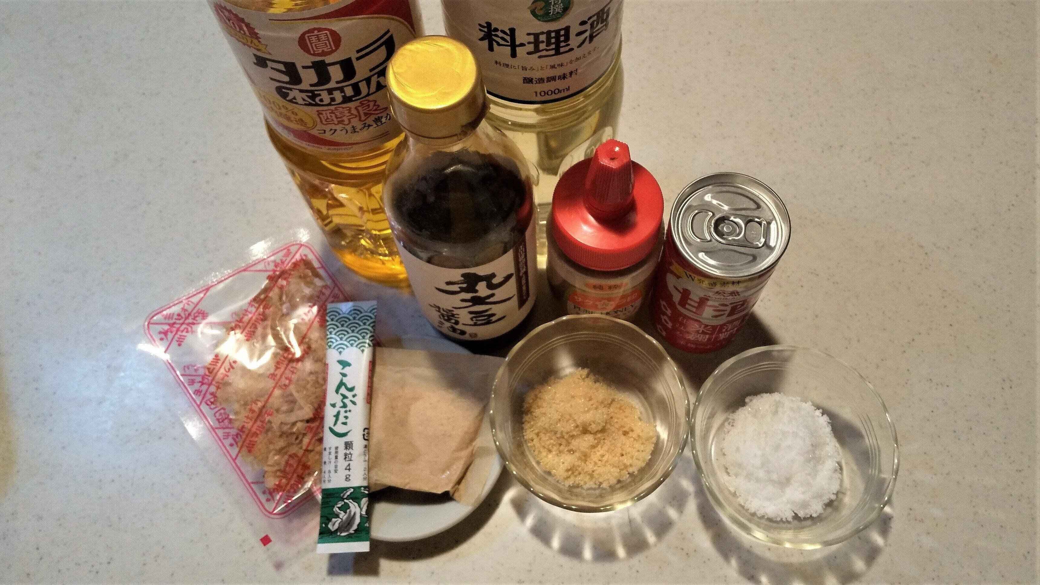 濃口しょうゆをベースに、かつお節、粉末だし、顆粒だし、をそれぞれ組み合わせ、さらにみりん、酒+甘味料(上白糖、三温糖、はちみつ、甘酒)を組み合わせると全部15通りあります。