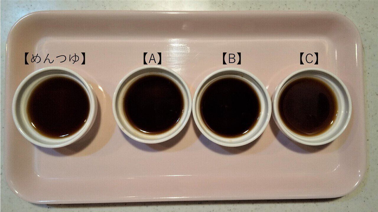 画像ではわかりにくいですが、めんつゆは少し透明感のある色をしています。この中で色が近いものは、濃口しょうゆの割合がほかよりも少なかった【C】となりました。