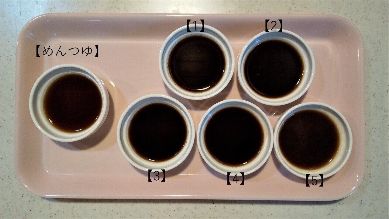 続いて、代用めんつゆを水で3倍ほどに薄めて食べ比べてみました。この場合でもいちばん好みだったのは【3】という結果に。