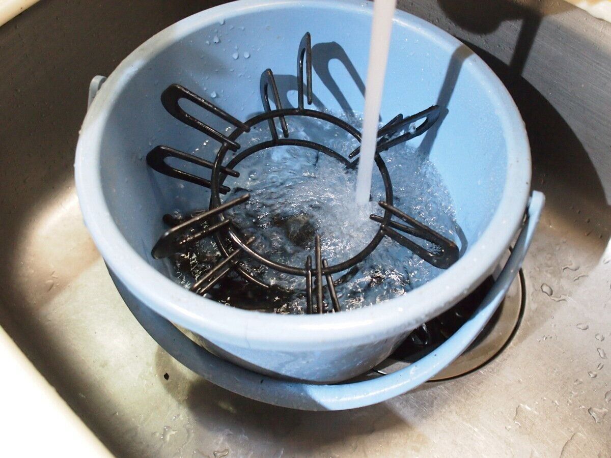 魚焼きグリルははずせる部分は全部外して、ぬるま湯に洗剤を入れたバケツでつけ置きしておきます。こちらも15~30分で取り出し、水道などで洗い流せばきれいになります。