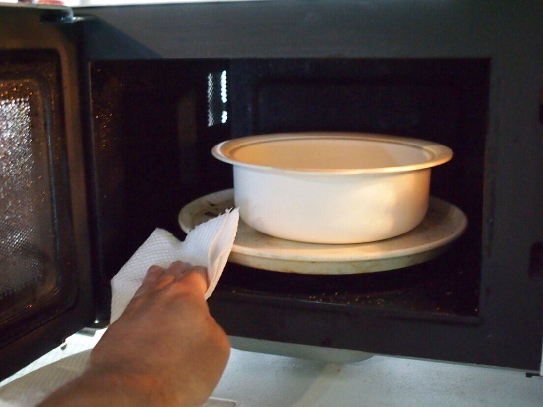 電子レンジは耐熱容器などに200mlの水と大さじ1杯の重曹を入れて、電子レンジで温めのボタンを押します。そのまま15~30分ほど放置すれば、汚れが浮き出てくるので、雑巾やキッチンペーパーで拭くだけ。