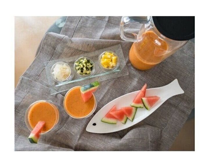 ガスパチョに「スイカ」を使うことで、ほのかな甘みが加わり、味わい深いスープになります。甘さがあるため、デザートやおやつなどにもおすすめです。