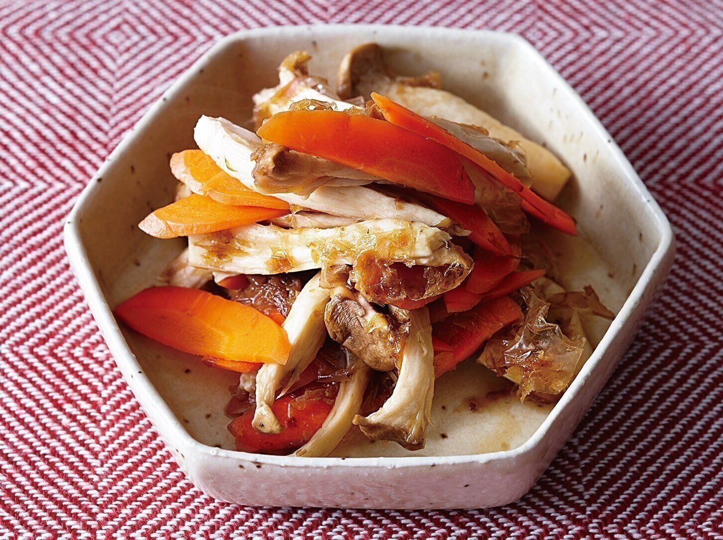 電子レンジでつくれる「にんじんとエリンギのポン酢あえ」のレシピです。ポン酢とかつお節のシンプルな味つけとなっているため、いくつも調味料を計る必要がなく簡単につくることができます。