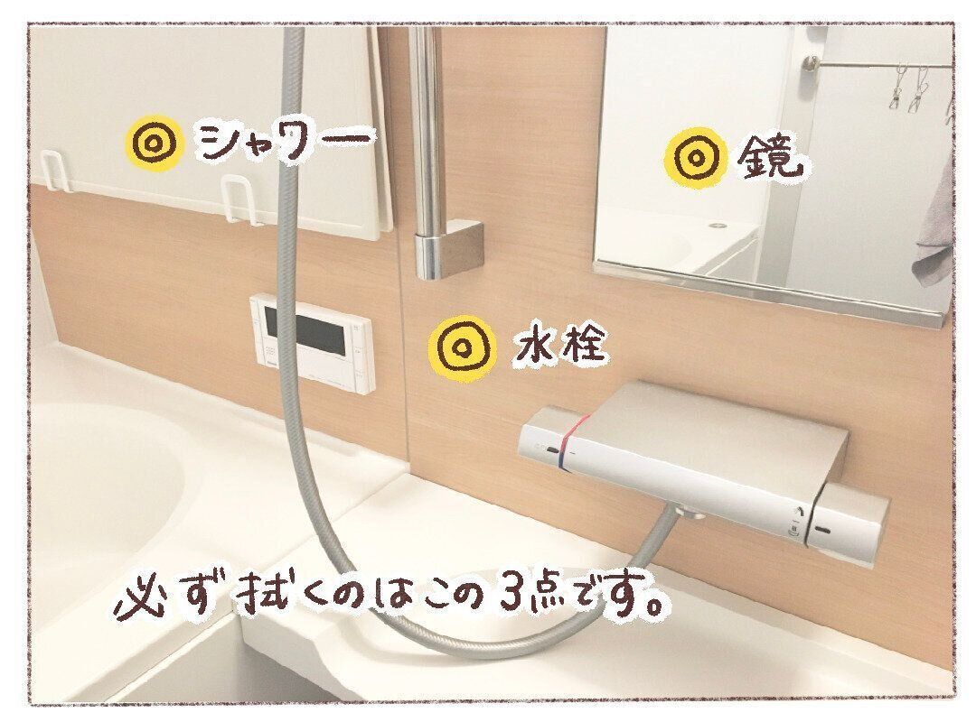 「シャワーの取っ手やバー」「鏡」「水栓」この3点は翌朝水アカが付く前にタオルで拭くようにしています。
