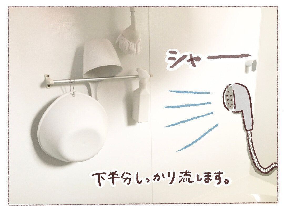 上半分はそこまで汚れが飛んでいないので、定期的にアルコールで掃除をするだけ。浴室が温かいうちに流した方が皮脂汚れなども落ちやすいですよね。